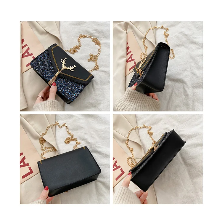 Featuring a sparkling chain, this bag adds a touch of glamour to any outfit, making it a standout piece.